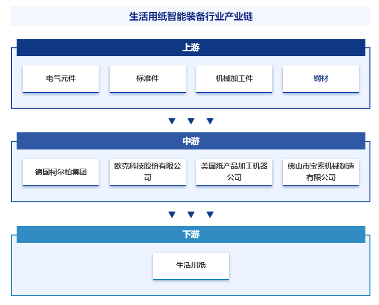 糊口用纸智能配备行业涉及的相关财产较多,其上业包罗电气元件、尺度零件、机械加工件、钢材出产行业等多个配套财产,其手艺程度、加工精度对糊口用纸智能配备产质量量具有较大影响。近年来,我国电气元件、尺度零件、机械加工手艺程度提拔较快,因为供应商相对较多、产物供给充脚。中逛为糊口用纸智能配备制制环节。下逛财产的规模扩张和产物布局变化对于糊口用纸智能配备的成长具有主要的推进感化;同时,下逛出产企业需求的不竭升级将指导智能配备行业向成套、高效、节能、智能化的标的目的成长,促使中高端设备的市场份额不竭提拔。